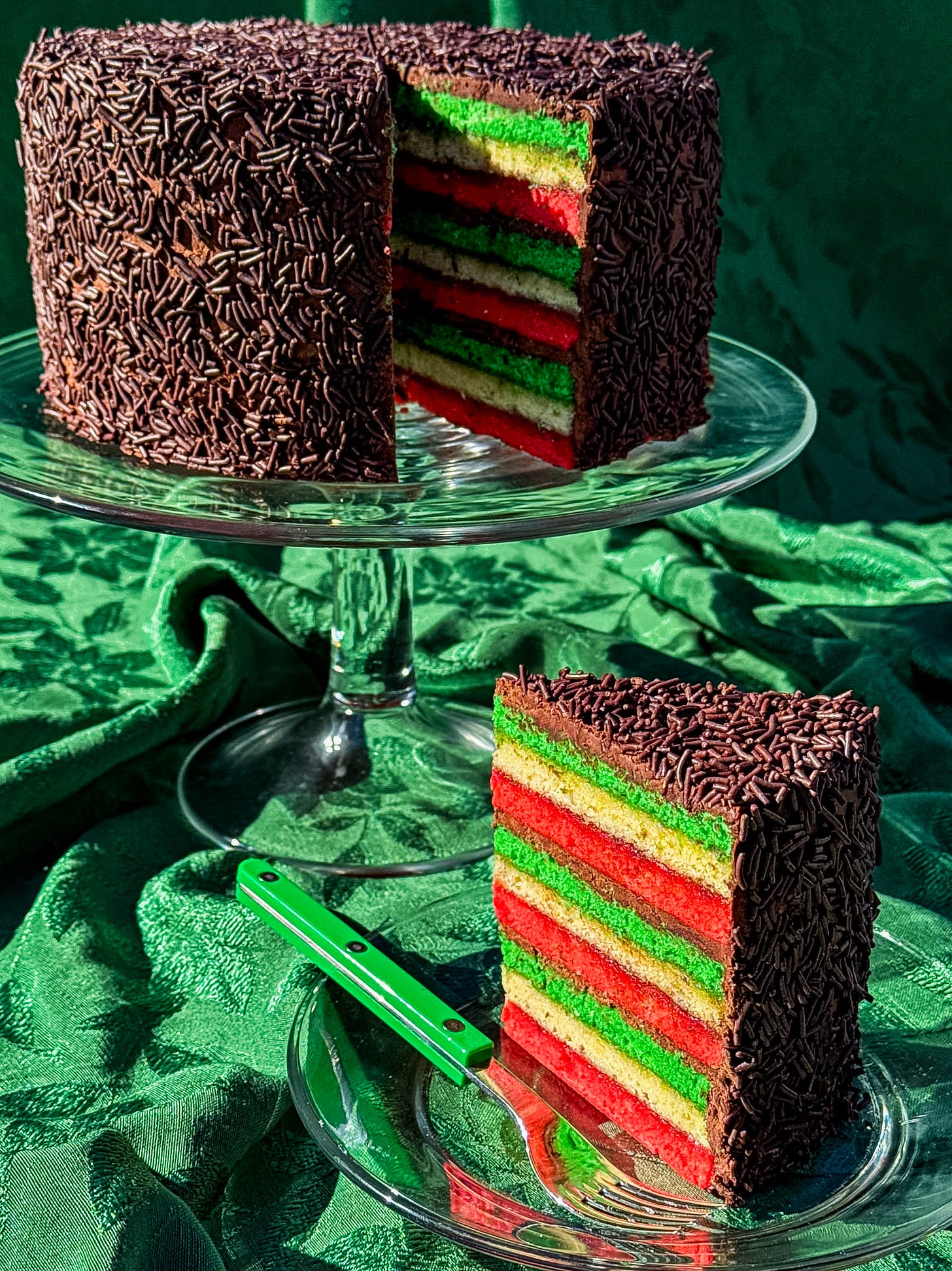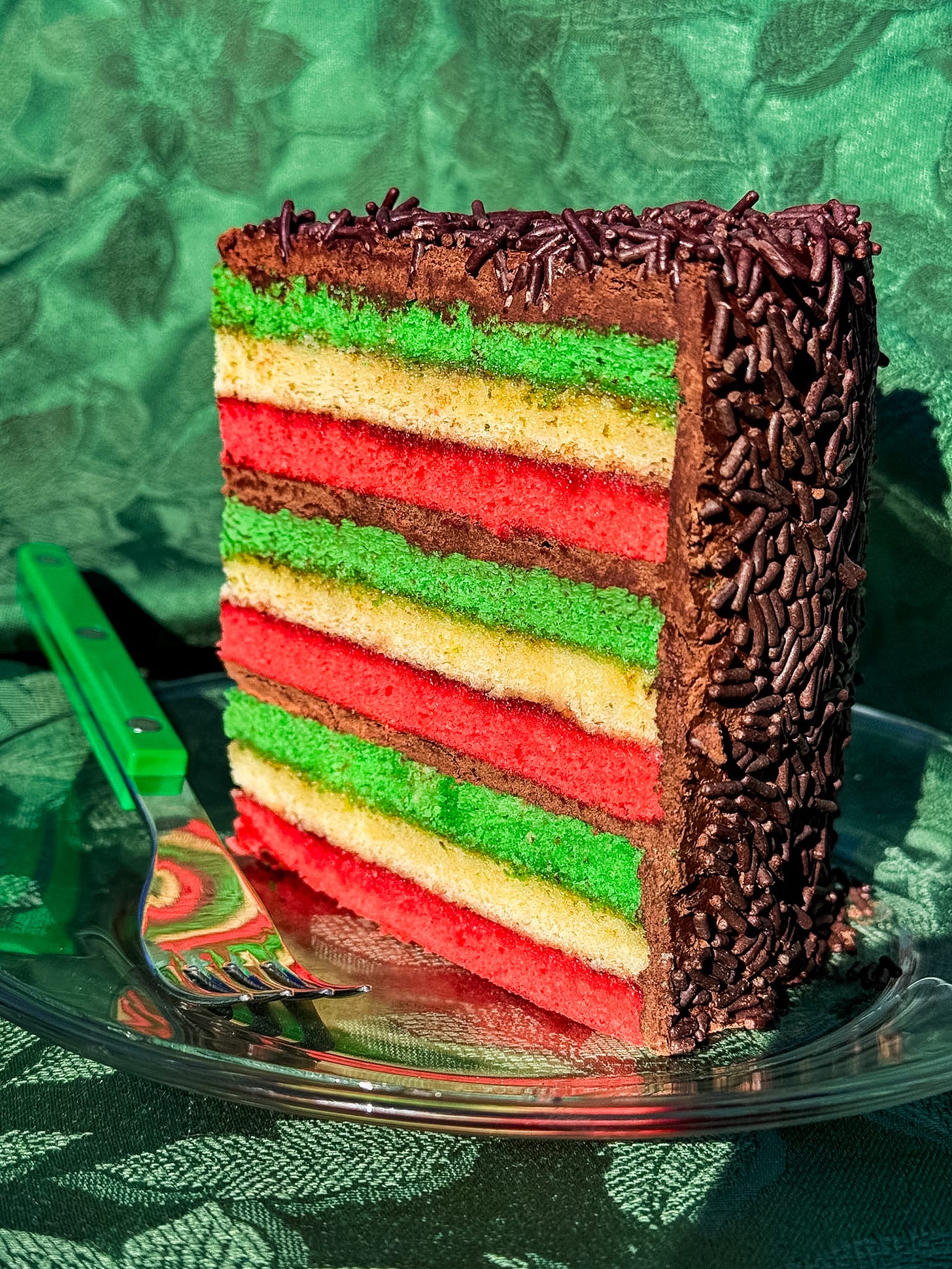 The first iteration of this cake was for my friend Arielle (who herself makes expert level rainbow cookies). The execution was simple, layers of a light almond sponge in the classic tricolor, raspberry jam sandwiched between them, a rich chocolate ganache poured over the outside. It was delightful.